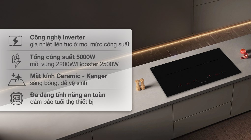 Công nghệ Inverter: Bếp tích hợp công nghệ Inverter giúp tiết kiệm điện năng hiệu quả, cho bếp vận hành ổn định và bền bỉ.