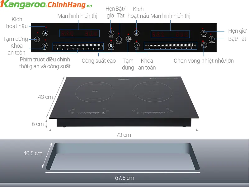 Kích thước bếp: Ngang 73 cm - Dọc 43 cm - Cao 6 cm