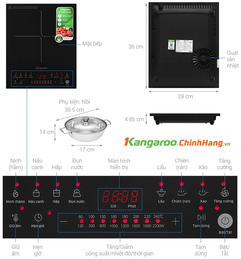 Bếp điện từ đơn Kangaroo KGIC22S2 là sản phẩm hiện đại, đáp ứng nhu cầu nấu nướng nhanh chóng và tiện lợi cho gia đình. Dưới đây là những thông tin chi tiết về sản phẩm: