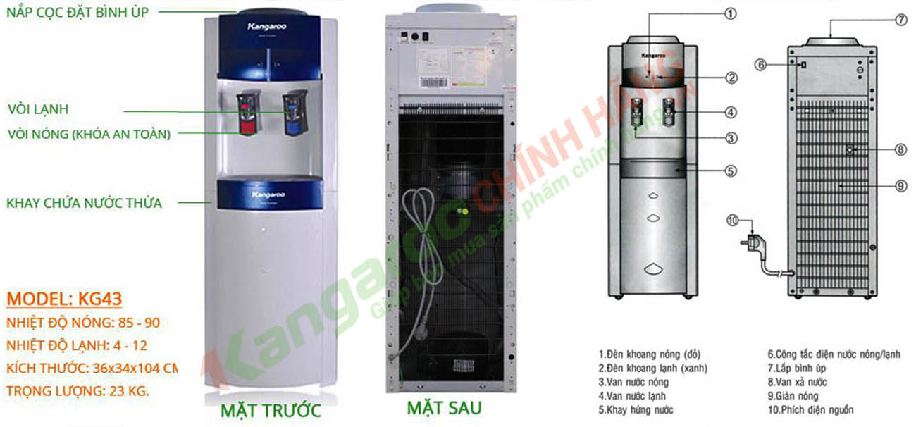 - Cây nước nóng lạnh Kangaroo KG43 là máy làm nóng, lạnh nước tiện lợi và an toàn, có kiểu dáng sang trọng phù hợp cho cả gia đình và văn phòng. Không cần quá mất thời gian và diện tích cho nhiều sản phẩm như tủ lạnh, ấm đun nước,… nhu cầu làm lạnh hoặc đun nóng nước nay được tích hợp trong một sản phẩm duy nhất – rất gọn gàng.- Cây nước nóng lạnh Kangaroo KG43 Được sản xuất trên dây chuyền công nghệ hiện đại, sử dụng chất liệu và hệ thống làm lạnh cao cấp, Cây nước nóng lạnh Kangaroo tuyệt đối an toàn cho sức khoẻ. Cùng rất nhiều những tính năng, thiết kế thông minh khác, Cây nước nóng lạnh Kangaroo là sản phẩm đáp ứng một cách tối ưu những nhu cầu của bạn.
