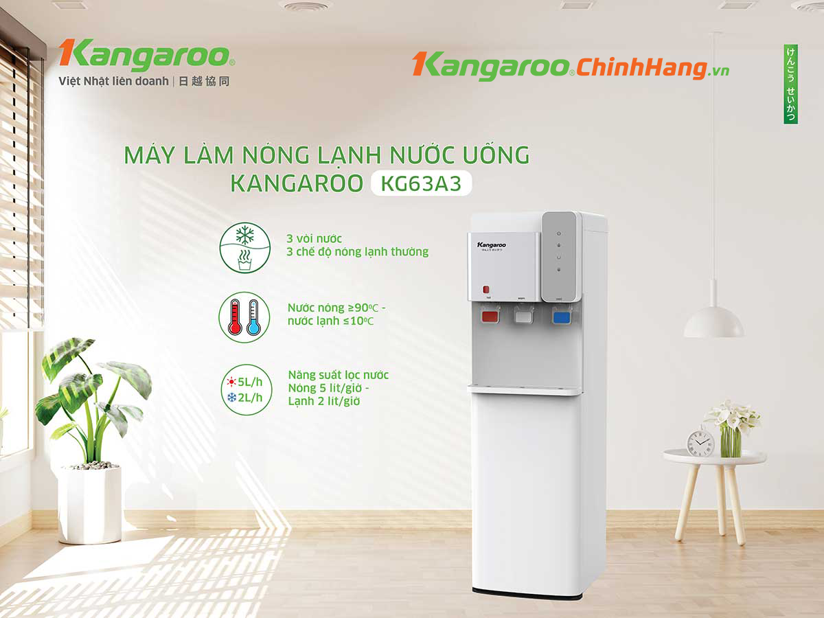 Cây nước nóng lạnh Kangaroo KG63A3 thiết kế âm bình gọn gàng, sang trọng phù hợp không gian của gia đình, văn phòng, nhà hàng, trung tâm thương mại… 3 vòi riêng biệt cùng 3 chế độ nóng - lạnh - thường tiện lợi phục vụ mọi nhu cầu giải khát và chế biến.