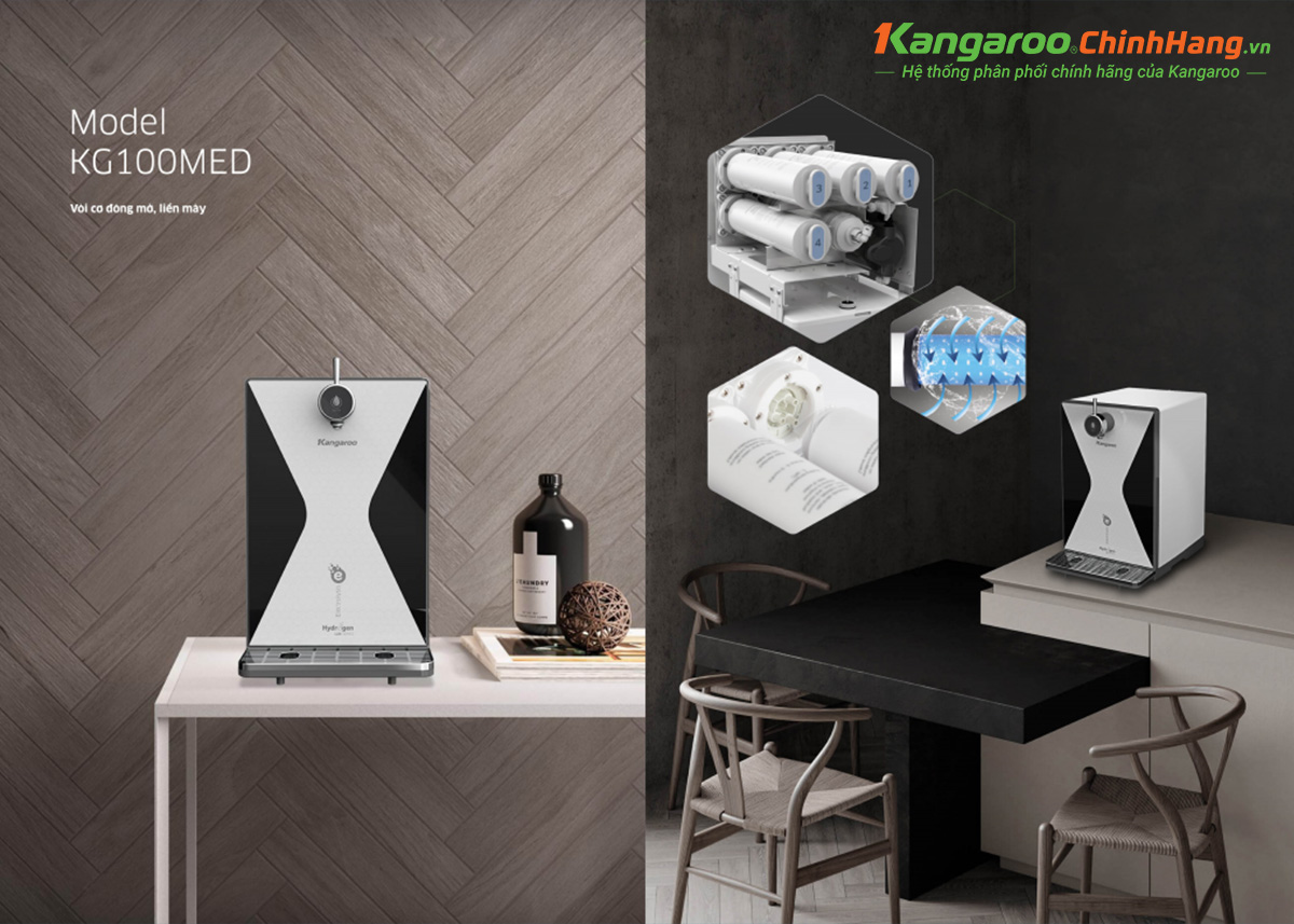- Model Kangaroo KG100MED sử dụng công nghệ điện phân nước RO đầu tiên và duy nhất tại Việt Nam để tạo nguồn nước ion kiềm giàu Hydrogen ưu việt, bền vững.