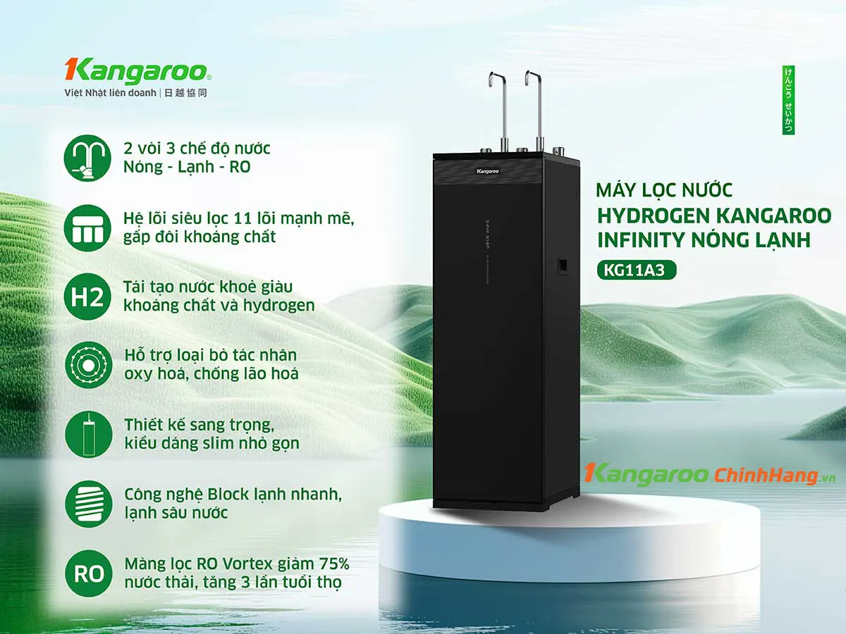 - Máy lọc nước Kangaroo Infinity KG11A3 sử dụng công nghệ tạo nước Hydrogen ưu việt bằng khoáng gốm.