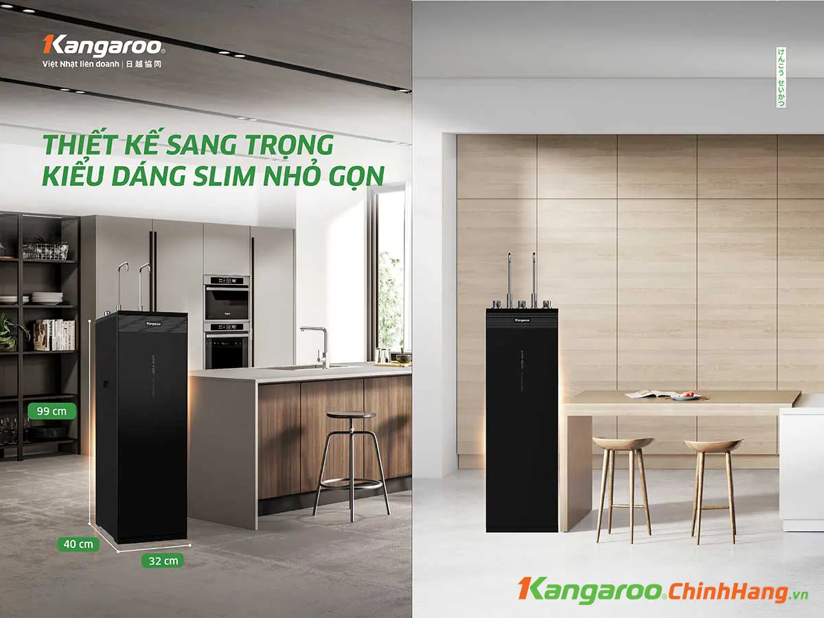 - Kiểu dáng SLIM nhỏ gọn, kích thước dài*sâu*cao lần lượt là 320*400*990 mm, thiết kế mặt kính cường lực tràn viền ấn tượng, Máy lọc nước nóng lạnh Kangaroo KG11A3 sẽ mang đến không gian sang trọng dù đặt máy tại bất cứ nơi đâu.