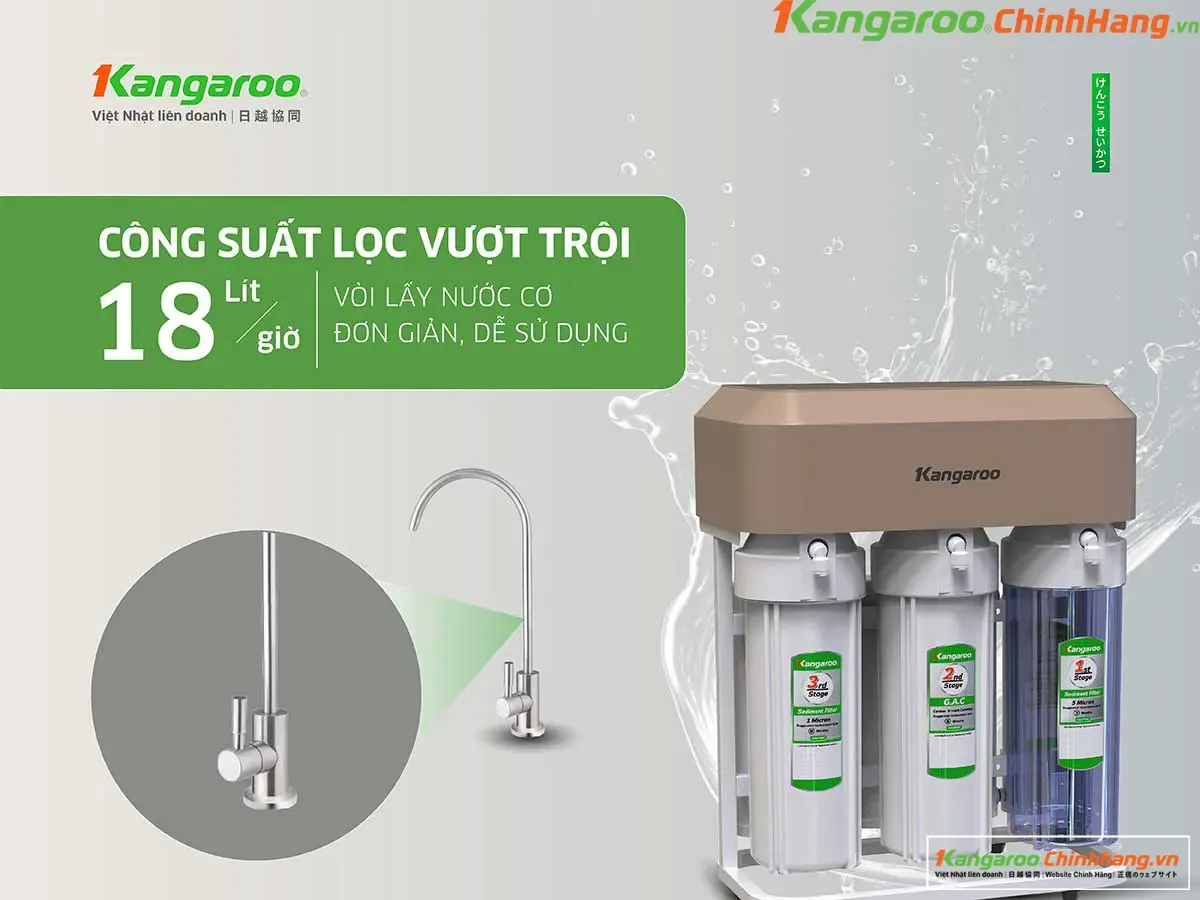 Với công suất lọc lên đến 18L/h, Kangaroo KG12K3-H1 đáp ứng thoải mái nhu cầu sử dụng liên tục cho gia đình 4–6 người/ngày.