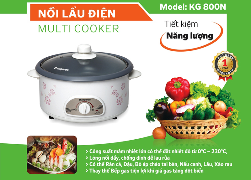 Nồi lẩu điện Kangaroo KG800N được trang bị nút điều chỉnh nhiệt độ tùy theo nhu cấu nấu nướng (lẩu, xào, luộc, chiên,…). Nắp nồi bằng vung kính giúp bạn tiện quan sát thức ăn trong nồi. Nồi có thể thay thế bếp ga tiện lợi, tiết kiệm năng lượng.