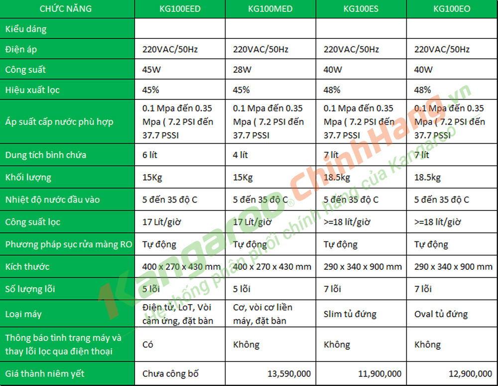 Với 4 model máy lọc nước ion kiềm được ra mắt gồm : KG100EED, KG100MED, KG100ES, KG100EO . Với việc ra mắt tới 4 model như vậy khiến nhiều khách hàng phân vân không biết nên chọn model nào cho phù hợp với gia đình mình. Vì vậy Kangaroochinhhang.vn xin tư vấn các bạn lựa chọn sản phẩm thông qua bài viết sau đây :